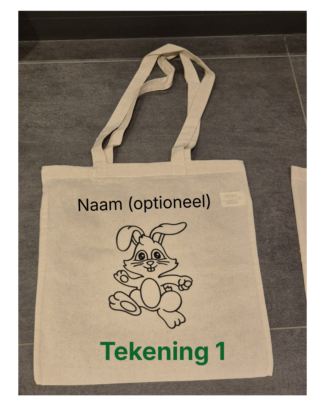 Deze inkleur-tas in paasthema is perfect om samen met je kind creatief aan de slag te gaan. Kies uit 2 leuke ontwerpen en maak de tas extra speciaal met de naam van je kind erop.